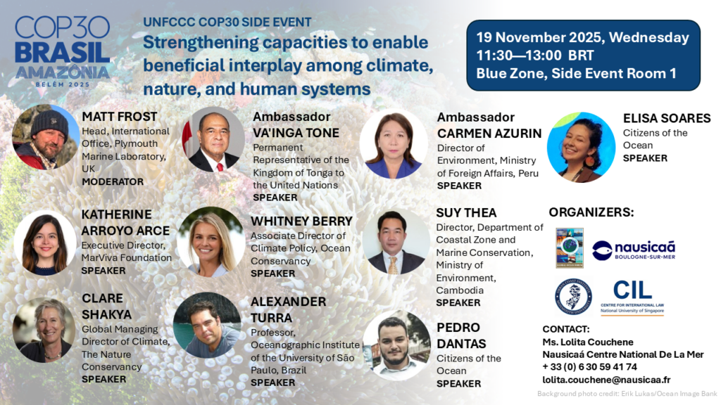 The CIL collaborated with several institutions ( International Coastal and Ocean Organization (dba Global Ocean Forum); Urban Coast Institute-Monmouth University; Nausicaa Centre National de la Mer, France and World Ocean Network) in convening a UNFCCC side event at COP30 (Bue Zone) on 19 Nov 2025, Belem, Brazil. The panel discussion on " Strengthening capacities to enable beneficial interplay among climate, nature, and human systems" explored the opportunities and challenges of innovative conservation and sustainable use efforts that:
