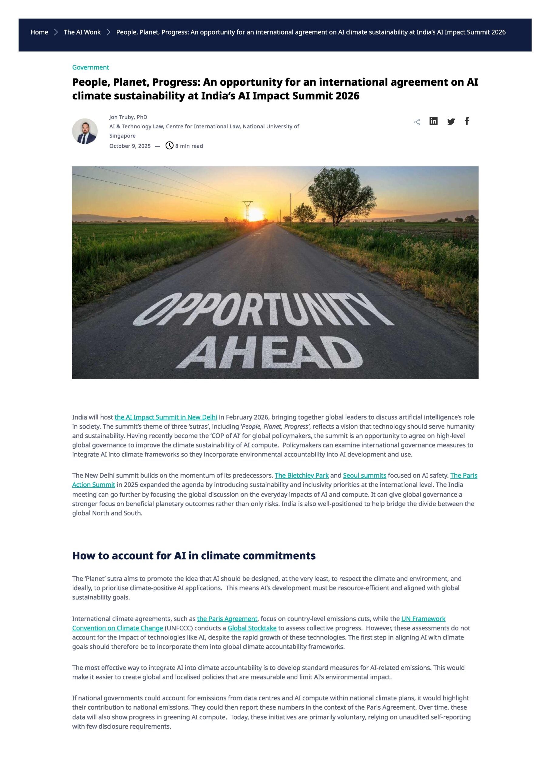 OECD.AI published a new commentary by CIL researcher Dr Jon Truby entitled ‘People, Planet, Progress: An opportunity for an international agreement on AI climate sustainability at India’s AI Impact Summit 2026’
