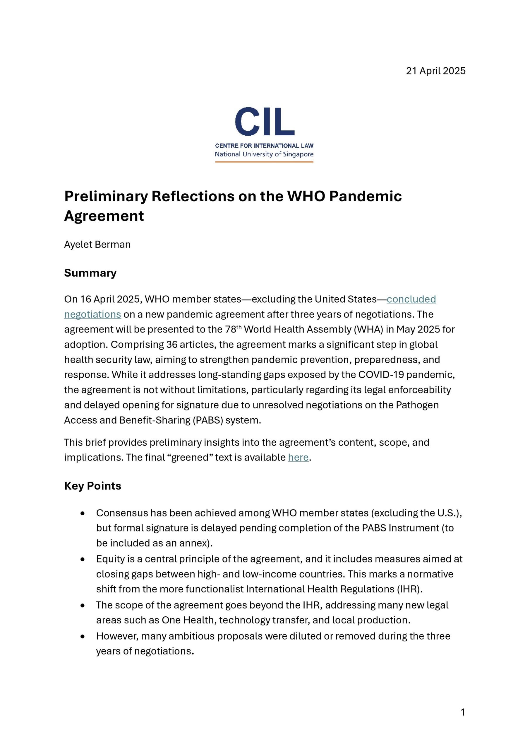 Preliminary Reflections on the WHO Pandemic Agreement